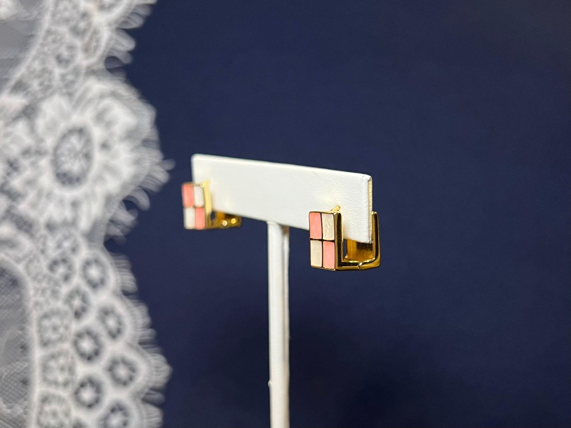 13mm square hoop earrings, available in both blue and pink options. The earrings and hardware are 18kt gold-filled, which is tarnish-resistant and waterproof.