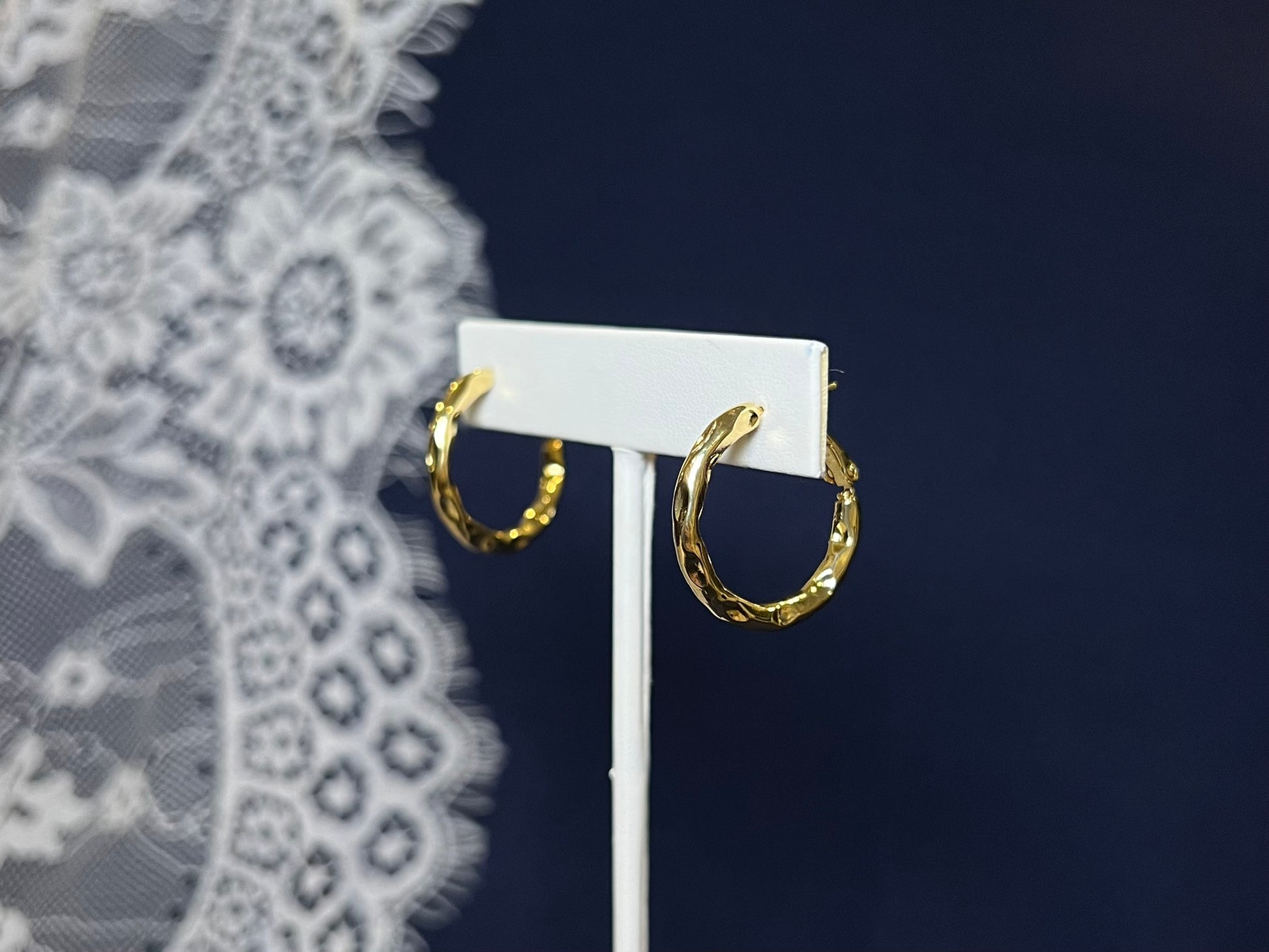 25mm hoop earrings with wavy pattern. The earrings and hardware are 18kt gold-filled, which is tarnish-resistant and waterproof.